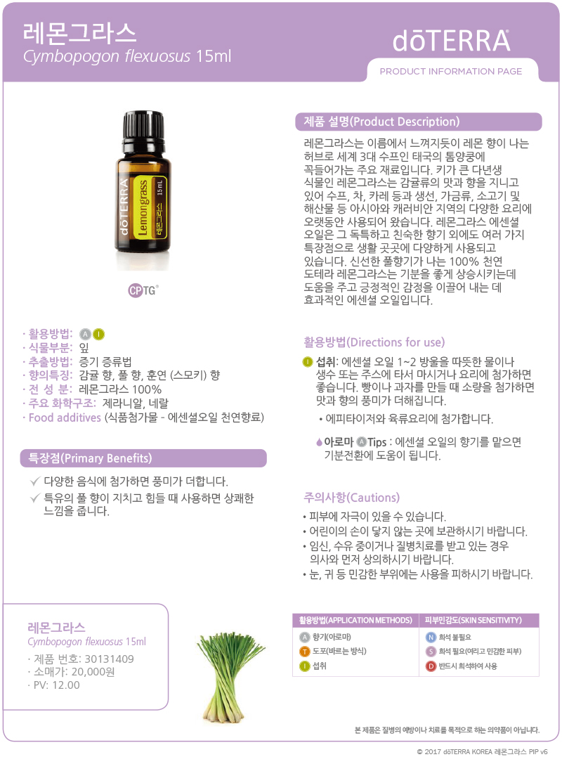 레몬그라스는 이름에서 느껴지듯이 레몬 향이 나는 허브로 세계 3대 수프인 태국의 톰양쿵에 꼭들어가는 주요 재료입니다. 키가 큰 다년생 식물인 레몬그라스는 감귤류의 맛과 향을 지니고 있어 수프, 차, 카레 등과 생선, 가금류, 소고기 및 해산물 등 아시아와 캐러비안 지역의 다양한 요리에 오랫동안 사용되어 왔습니다. 레몬그라스 에센셜 오일은 그 독특하고 친숙한 향기 외에도 여러 가지 특장점으로 생활 곳곳에 다양하게 사용되고 있습니다. 신선한 풀향기가 나는 100% 천연 도테라 레몬그라스는 기분을 좋게 상승시키는데 도움을 주고 긍정적인 감정을 이끌어 내는 데 효과적인 에센셜 오일입니다.