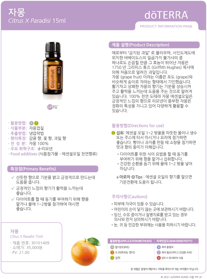 예로부터 “금지된 과일” 로 불리우며, 서인도제도에 위치한 바베이도스의 일곱가지 불가사의 중 하나로도 손꼽힐 만큼 그 효능이 뛰어난 자몽은 1750 년 그리피스 휴즈 (Griffith Hughes) 목사에 의해 처음으로 알려진 과일입니다. 자몽 (grape fruit) 이라는 이름은 포도 (grape)와 비슷하게 송이로 자라는 형태에서 기인했습니다. 활기차고 상쾌한 자몽의 향기는 기분을 상승시켜 주고 활력을 느끼는데 도움을 주는 것으로 알려져 있습니다. 100% 천연 도테라 자몽 에센셜오일은 긍정적인 느낌의 향으로 리모넨이 풍부한 자몽은 정화의 특성을 지니고 있어 다양하게 활용할 수 있습니다.
