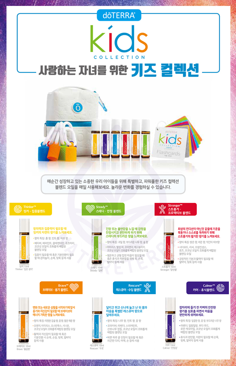 매순간 성장하고 있는 소중한 우리 아이들을 위해 특별하고, 파워풀한 키즈 컬렉션 블렌드 오일을 매일 사용해 보세요.