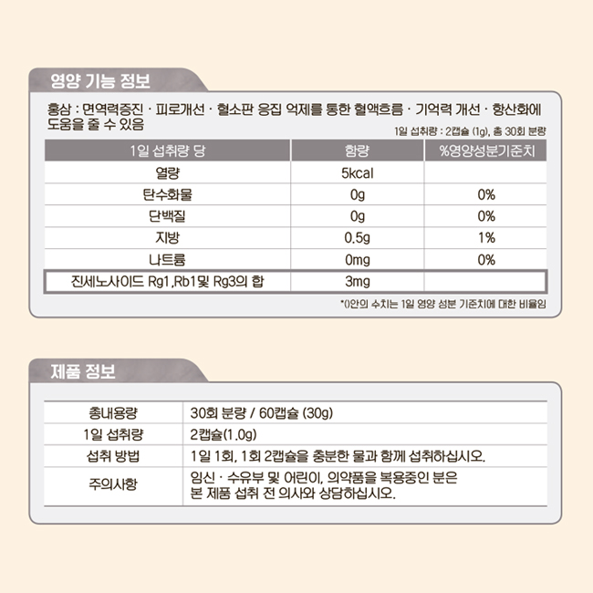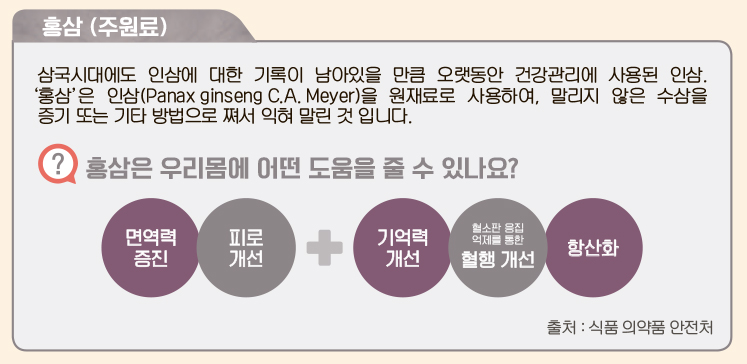 - 홍삼 : 면역력 증진 · 피로 개선 · 혈소판 응집 억제를 통한 혈액 흐름 · 기억력 개선 · 항산화에 도움을 줄 수 있음