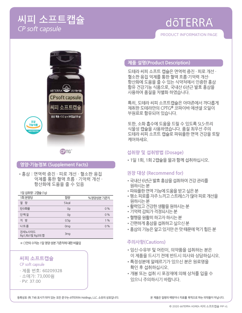 도테라 씨피 소프트 캡슐은 면역력 증진 · 피로 개선 · 혈소판 응집 억제를 통한 혈액 흐름·기억력 개선· 항산화에 도움을 줄 수 있는 식약처에서 인증한 홍삼 함유 건강기능 식품으로, 국내산 6년근 발효 홍삼을 사용하여 품질을 차별화 하였습니다.