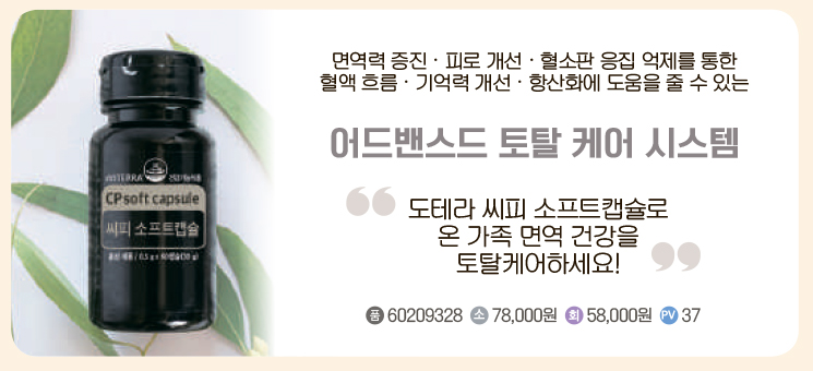 또한, 소화 흡수에 도움을 드릴 수 있도록 SLS-프리 식물성 캡슐을 사용하였습니다. 품질 최우선 주의 도테라 씨피 소프트 캡슐로 파워풀한 면역 건강을 토탈 케어하세요.