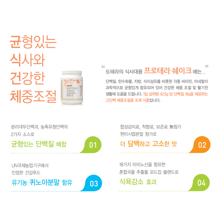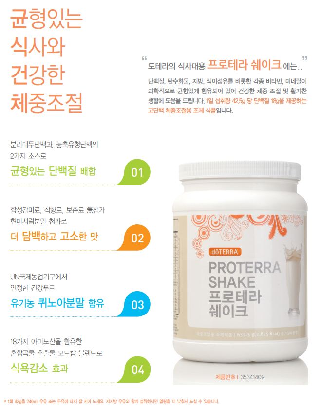 도테라 프로테라 쉐이크는 에너지 공급원인 단백질을 비롯하여 칼슘, 비타민 C, 비타민 E, 비타민 A, 비타민 B6, 비타민 B2, 비타민 B1, 아연, 철, 나이아신, 엽산, 식이섬유 등 균형잡힌 영양 성분이 최적의 비율로 함유되어 있는 건강한 체중조절용조제식품입니다.