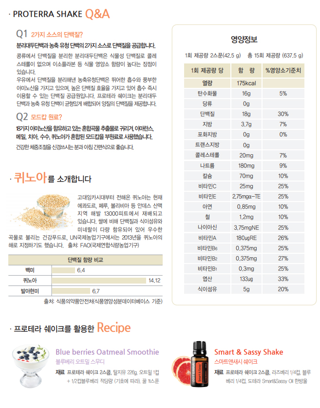 특히, 분리대두 단백과 농축 유청 단백의 두 가지 단백질을 모두 함유하고 있을 뿐 아니라, 퀴노아 추출분말, 귀리혼합 추출분말 등 18가지 아미노산을 함유한 혼합 곡물 추출물이 더해져 영양섭취의 불균형이 쉬운 현대인에게 더욱 적합한 식품입니다.