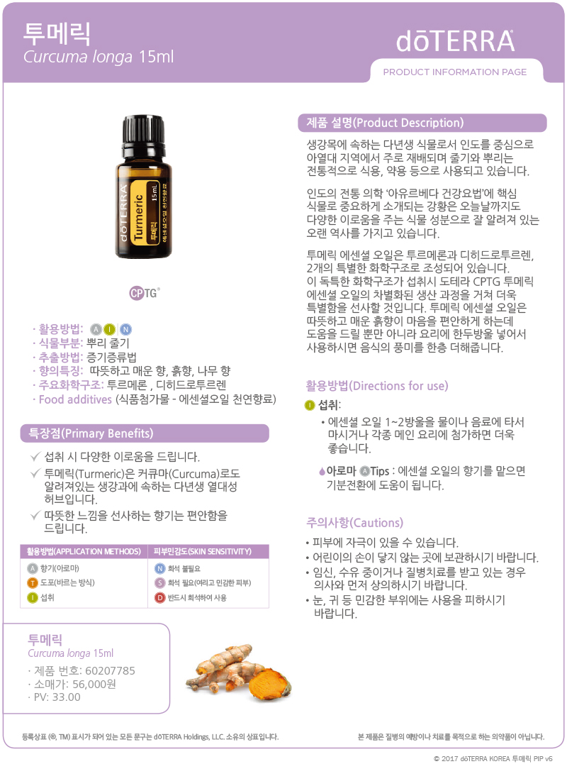 투메릭 에센셜 오일은 투르메론과 디히드로투르렌, 2개의 특별한 화학구조로 조성되어 있습니다. 이 독특한 화학구조가 섭취시 도테라 CPTG 투메릭 에센셜 오일의 차별화된 생산 과정을 거쳐 더욱 특별함을 선사할 것입니다. 투메릭 에센셜 오일은 따뜻하고 매운 흙향이 마음을 편안하게 하는데 도움을 드릴 뿐만 아니라 요리에 한두방울 넣어서 사용하시면 음식의 풍미를 한층 더해줍니다.