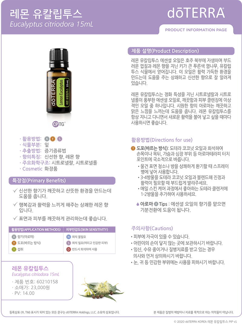 레몬 유칼립투스 에센셜 오일은 호주 북부에 자생하며 부드 러운 껍질과 레몬 향을 지닌 키가 큰 푸른색 껌나무, 유칼립 투스 식물에서 얻어집니다.