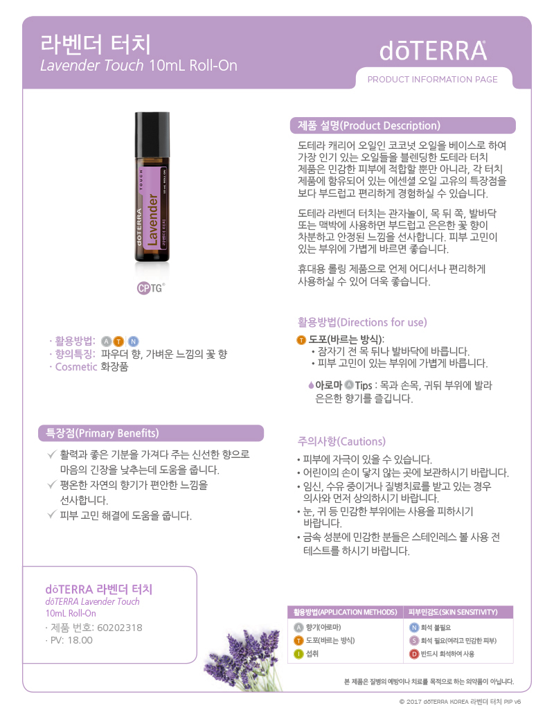 도테라 캐리어 오일인 코코넛 오일을 베이스로 하여 가장 인기 있는 오일들을 블렌딩한 도테라 터치 제품은 민감한 피부에 적합할 뿐만 아니라, 각 터치 제품에 함유되어 있는 에센셜 오일 고유의 특장점을 보다 부드럽고 편리하게 경험하실 수 있습니다.