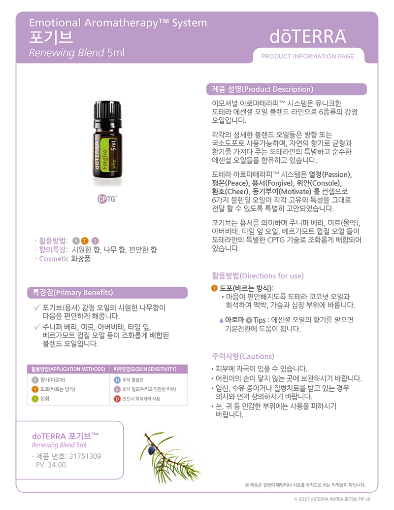 포기브는 용서를 의미하며 주니퍼 베리, 미르(몰약), 아버비테, 타임 잎 오일, 베르가모트 껍질 오일 들이 도테라만의 특별한 CPTG 기술로 조화롭게 배합되어 있습니다.
