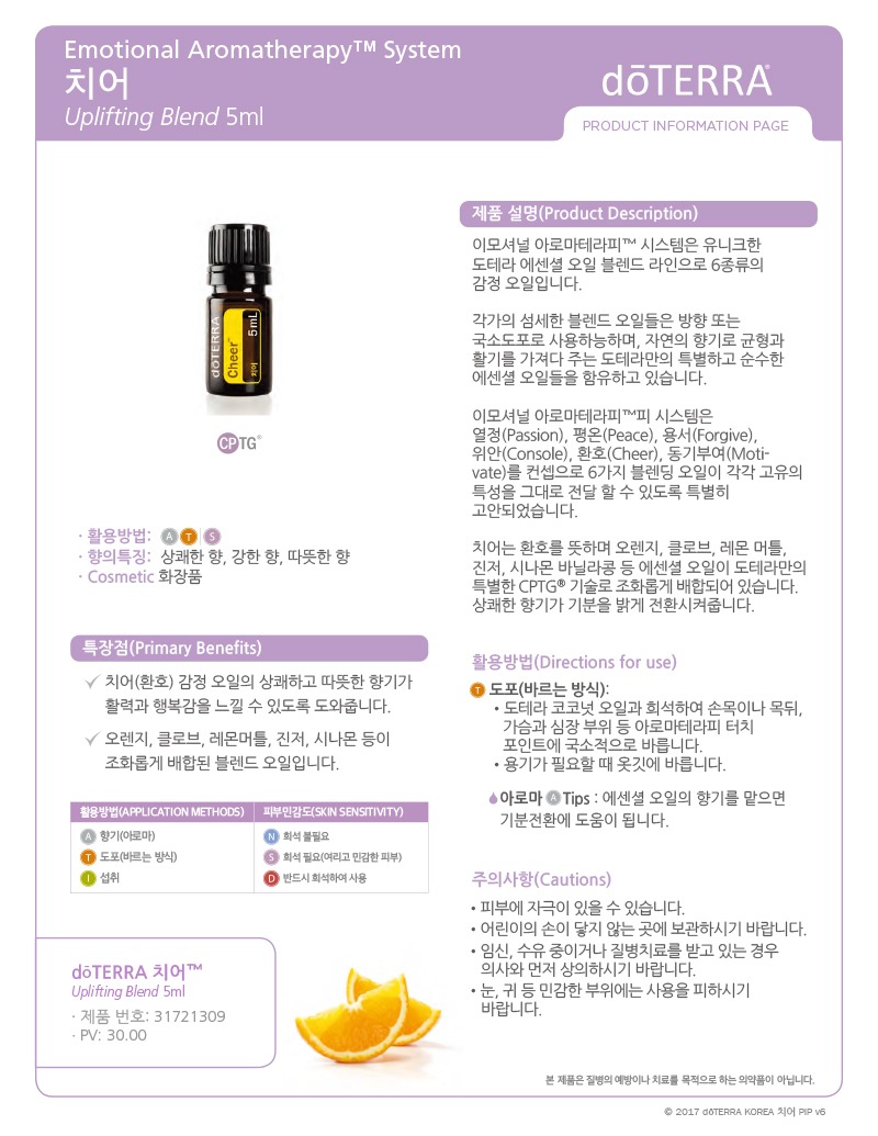 - 치어(환호) 감정 오일의 상쾌하고 따뜻한 향기가 활력과 행복감을 느낄 수 있도록 도와줍니다.