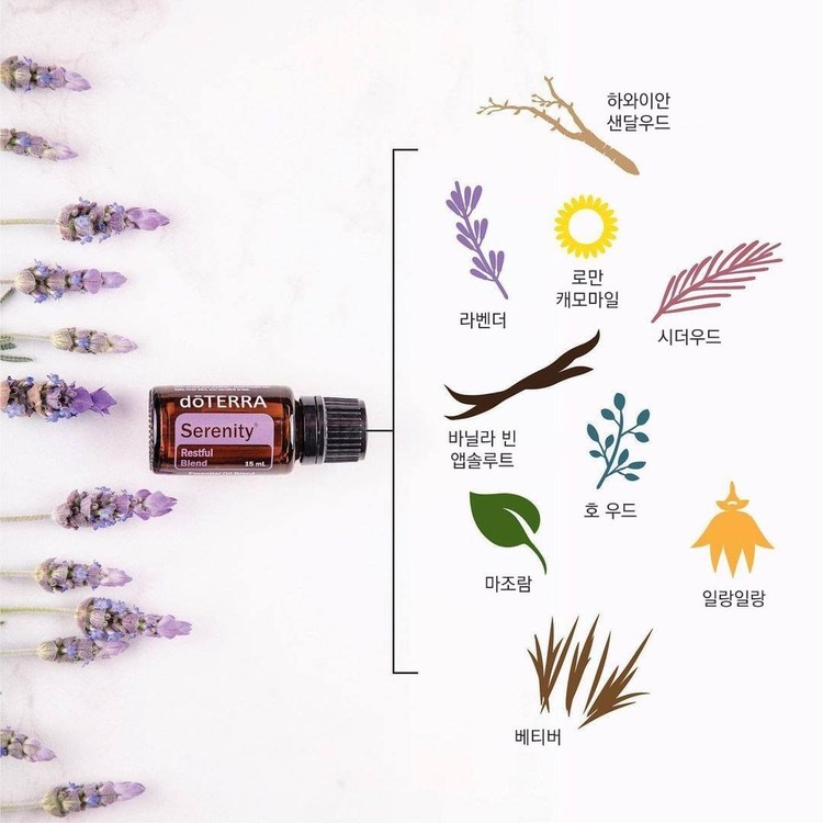 세레니티 블렌드 오일은 라벤더, 마조람, 로만 캐모마일, 일랑일랑 등 몸과 마음을 차분하게 해주는 특성을 지닌 오일들을 조화롭게 배합한 도테라 만의 특별한 블렌드 오일로 마음을 차분하게 진정 시키고 안정감을 느끼는데 도움을 주는 향입니다. 따뜻한 향기로 편안한 잠자리 환경을 만드는데 도움을 줍니다.