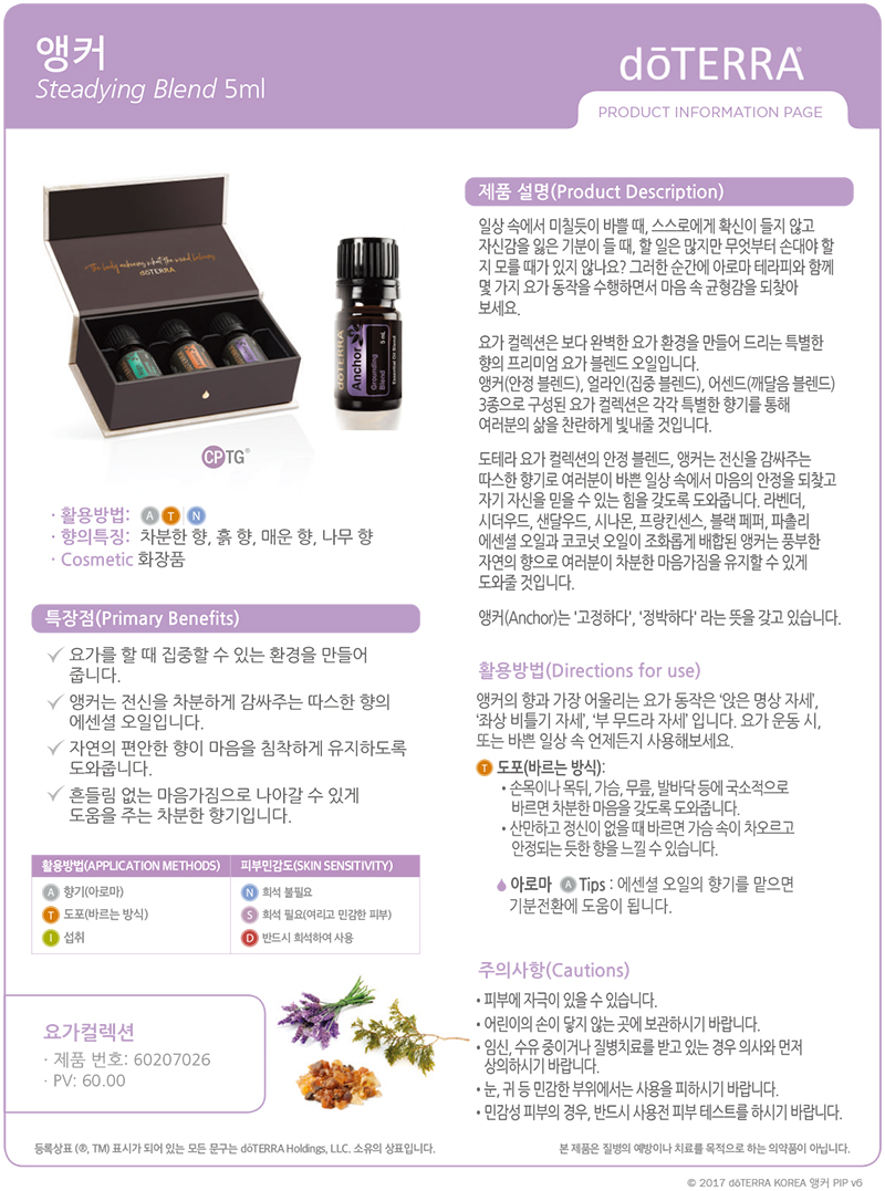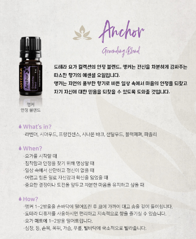도테라 요가 컬렉션의 안정 블렌드, 앵커는 전신을 감싸주는 따스한 향기로 여러분이 바쁜 일상 속에서 마음의 안정을 되찾고 자기 자신을 믿을 수 있는 힘을 갖도록 도와줍니다.
